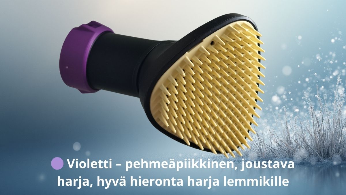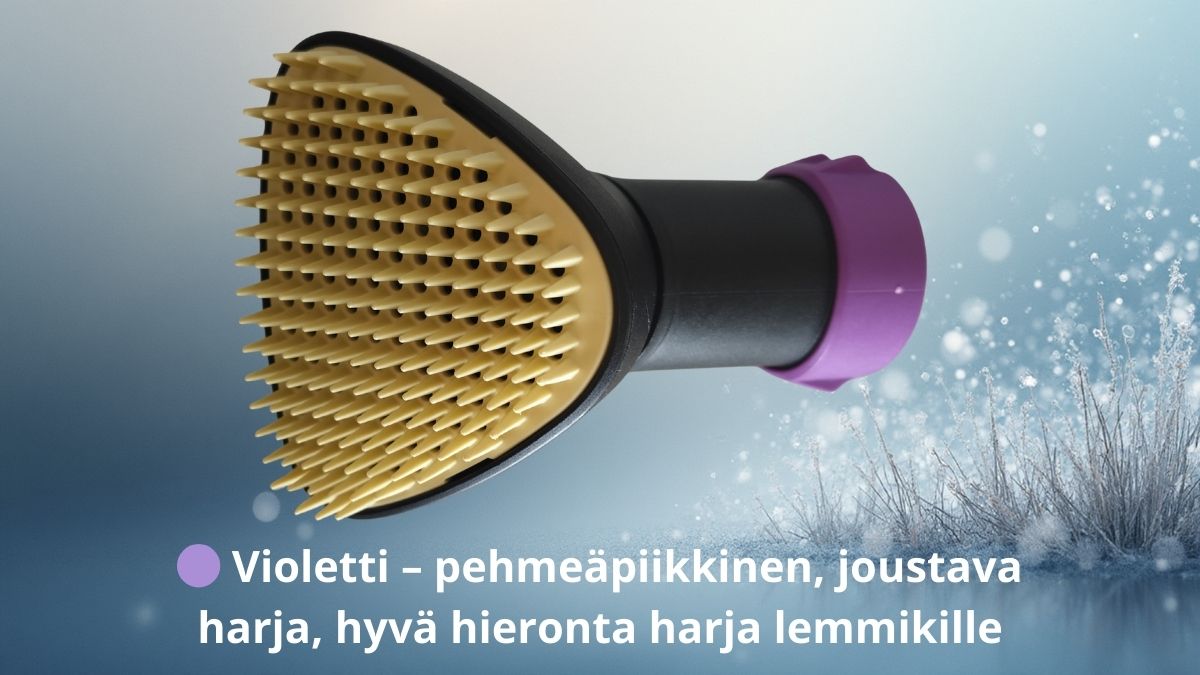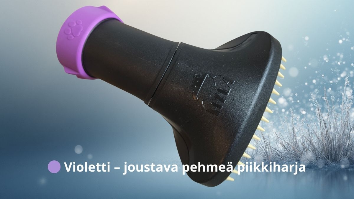 🟣 Violetti – pehmeäpiikkinen, joustava harja, hyvä hieronta harja lemmikille